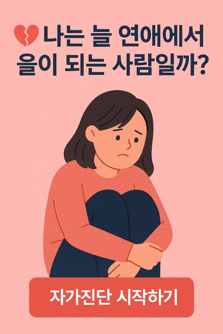 💡 나는 늘 연애에서 을(乙)이 되는 사람일까? 사랑을 하면 더 많이 베풀고 더 많이 참는 건 나만 같나요?그 감정 뒤엔 ‘관계 속 을(乙)’이 되는 무의식 패턴이 숨어 있을지 모릅니다.아래 자가진단으로 내 연애 포지션을 확인해보세요. 🔍 지금 바로 자가진단 시작하기 📌…
