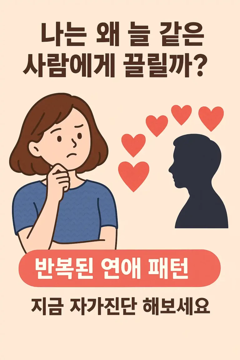 “왜 나는 매번 같은 사람에게 끌릴까?” 이별 후에도 비슷한 상처를 반복한다면, 그것은 운명이 아닌 패턴일 수 있습니다. 지금 간단한 자가진단으로 내 연애의 반복 고리를 들여다보세요. 🧠 반복된 연애 패턴, 무의식의 함정일까? 자가진단 테스트 바로가기 📚 목차 자가진단 체크리스트 (20문항) 결과…