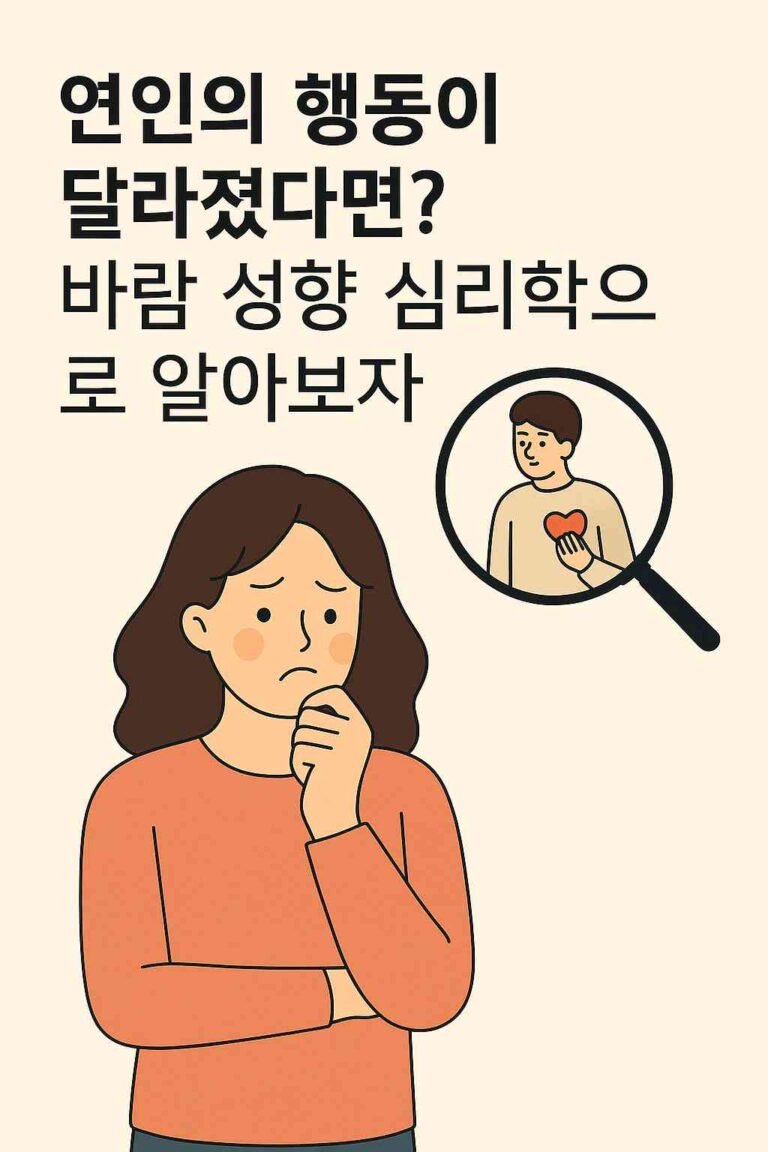 💔 내 연인은 바람끼가 있는 사람일까? 핸드폰을 숨기고, 외모에 과하게 신경 쓰기 시작했다면…‘설마’ 하는 불안, 체크리스트로 함께 확인해보세요. 🔍 지금, 연인의 행동을 체크해보세요자가진단 바로가기 📚 목차 자가진단 체크리스트 결과 해석 전문가 코멘트 바람 성향의 심리 배경 관계 지키기 3가지…